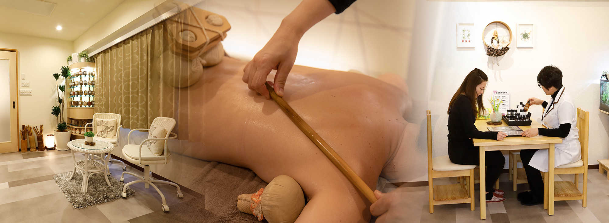 フットバス、よもぎ蒸し座浴、さらに独自のホット黃土ボールアロマセラピー・最新のバンブーセラピーの